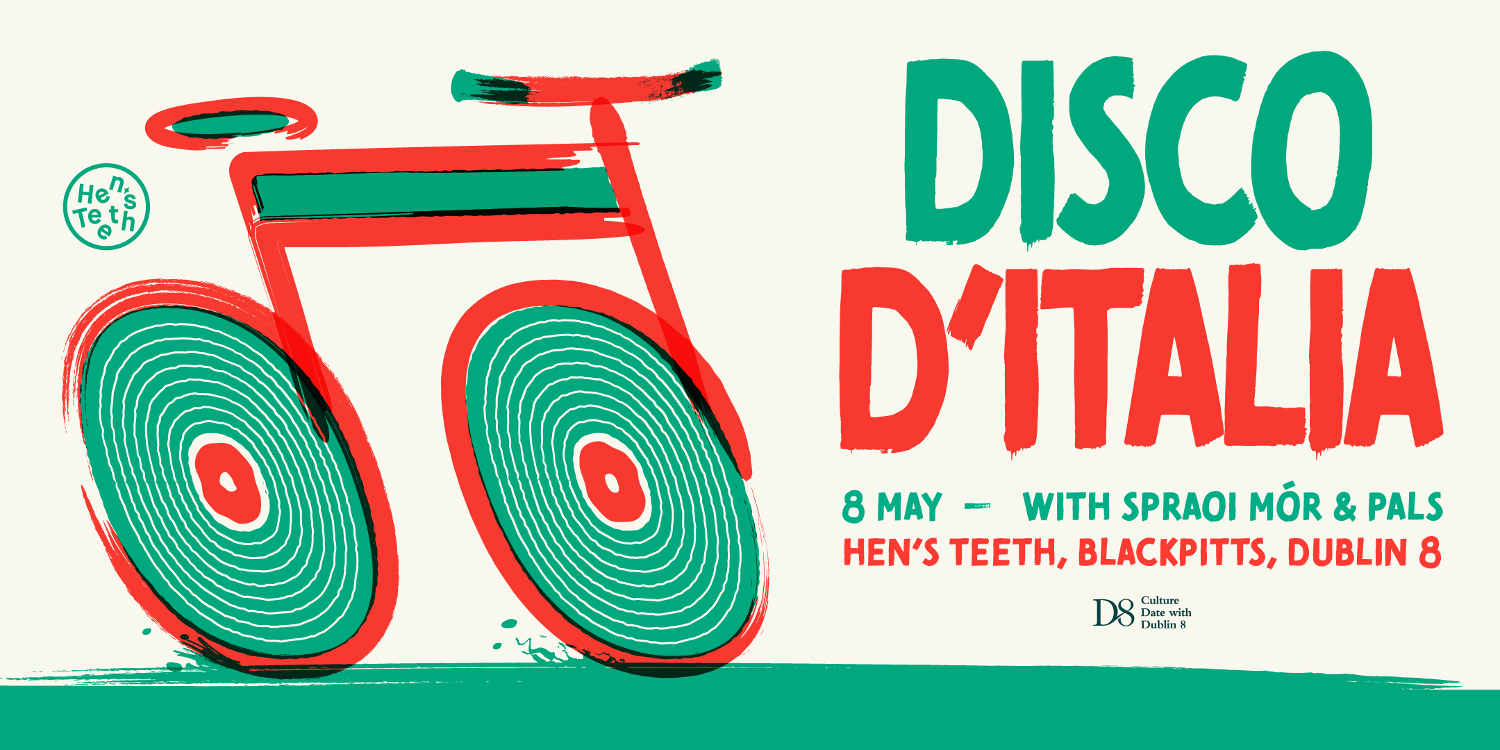 Back to All Events Disco D'Italia Friday 8 May 2026 16:00 17:00 Hen's Teeth Blackpitts Dublin, D08A9FD Ireland (map) Google Calendar ICS To celebrate the kickoff of Giro D'Italia 2026, we're throwing a Italo Disco party at Hen's Teeth with Spraoi Mor on the decks! Tickets
