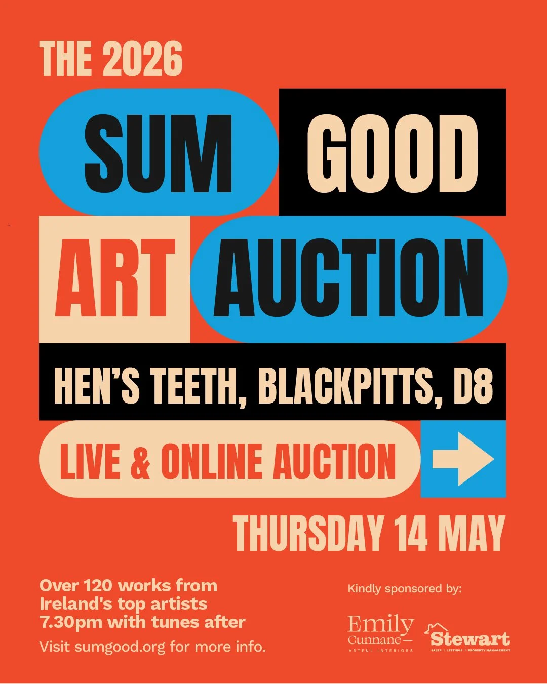 Dublin, Ireland — April 2026 — The SumGood Art Auction returns for its 2026 edition on Thursday, 14 May at 7:30pm, bringing together an exciting lineup of contemporary artists for an evening of art, community, and impact. This year’s event will take place in the unreal space that is Hen’s Teeth in Blackpitts, Dublin 8.