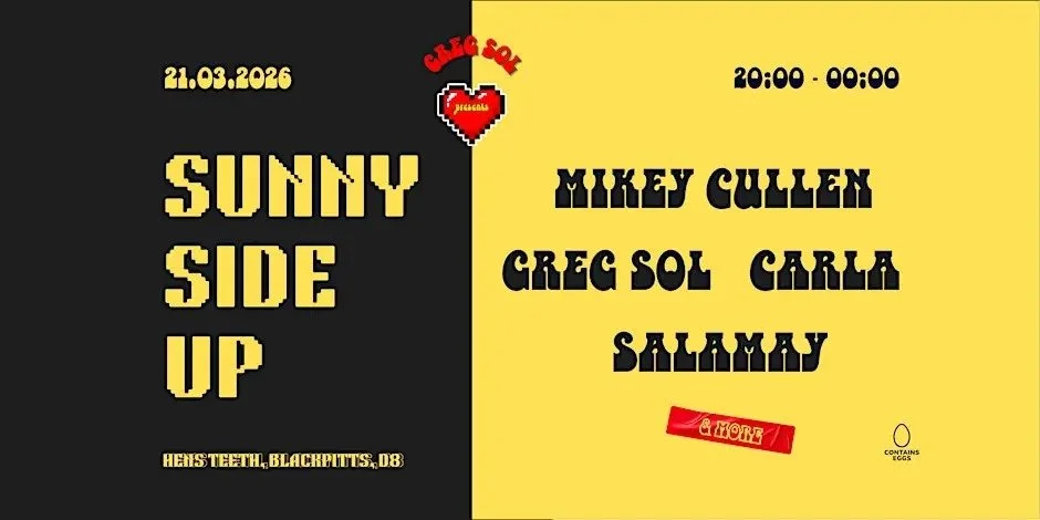 Sunny Side Up Saturday 21 March 2026 14:30 15:30 Hen's Teeth Blackpitts Dublin, D08A9FD Ireland (map) Google Calendar ICS Step into a dimension of intimacy and connection, where hot Irish talent will move your feet and your soul .SUNNY SIDE UPa listening experience guided by Greg Sol Tickets